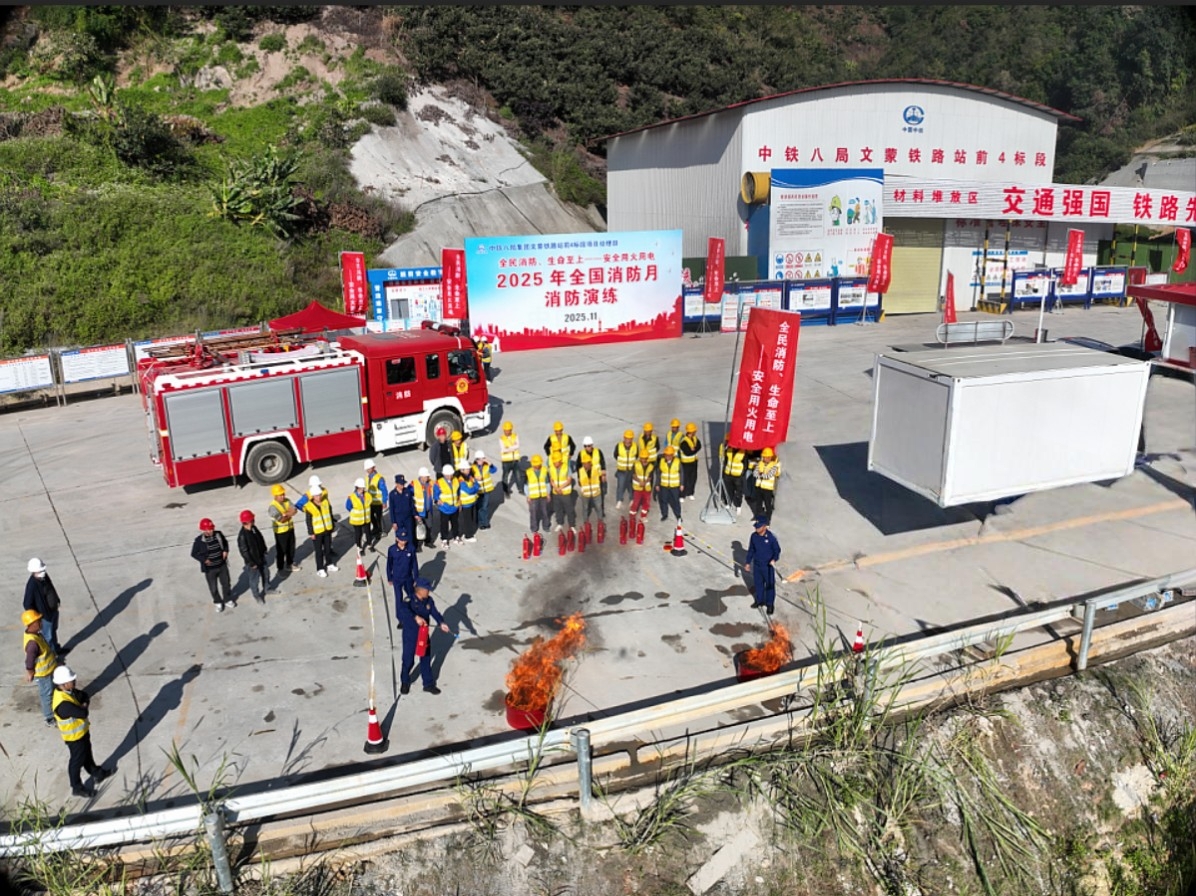 近日,集团公司文蒙铁路4标项目部在中岭山隧道出口临时物料区组织开展火灾应急处置消防应急演练。